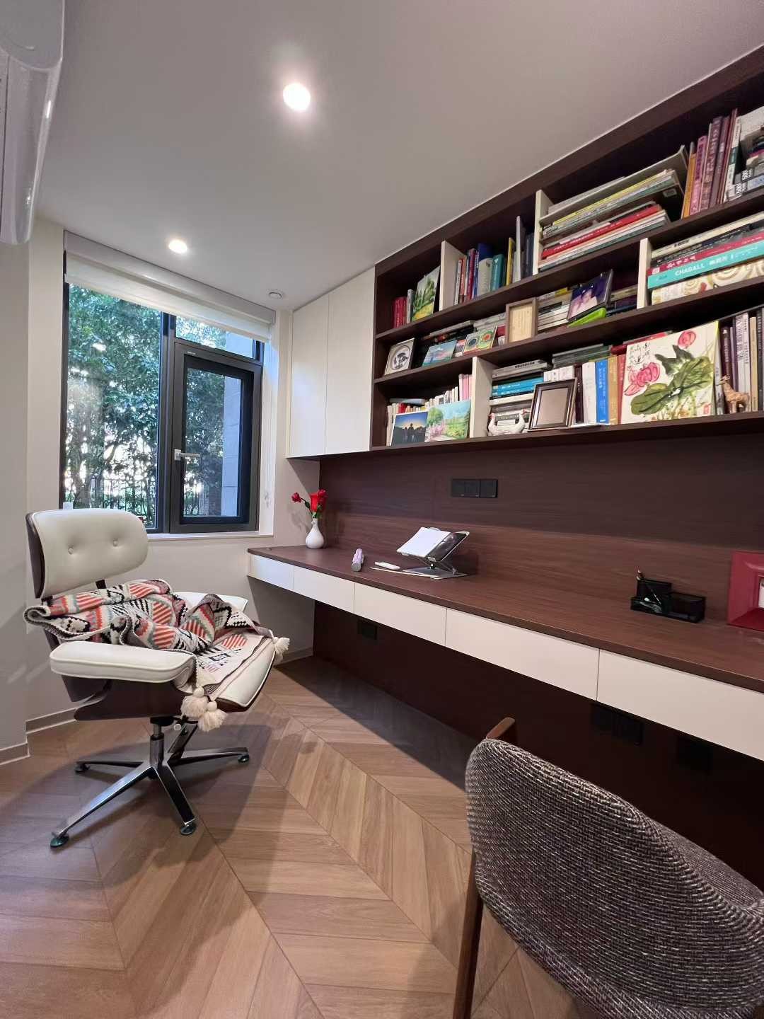 桌面預留插座、走線槽,滿足辦公設(shè)備使用需求;書柜高度貼合墻面,兼顧收納與視覺整潔,窗邊位置打造 “閱讀角”,自然光充足,適合長時間工作或閱讀。