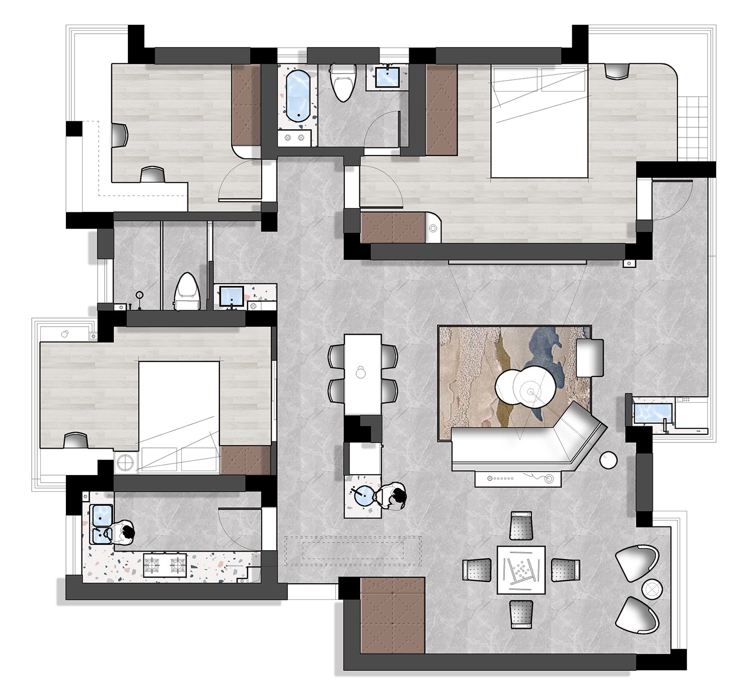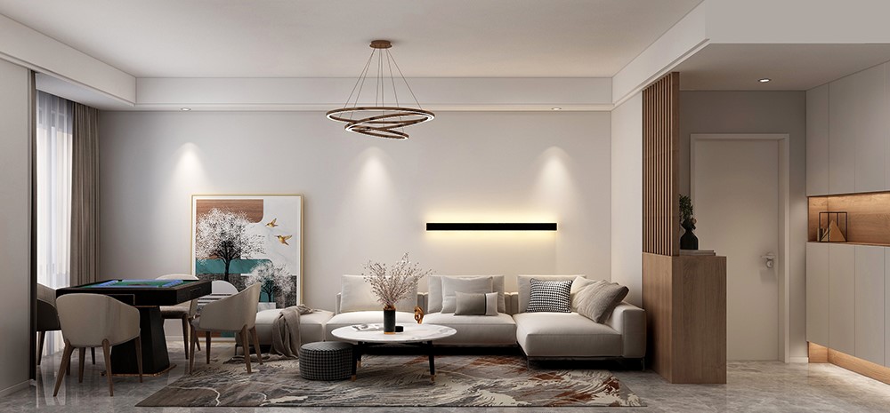結(jié)合洄游性動(dòng)線,沙發(fā)居中擺放整體空間更顯簡潔大氣
