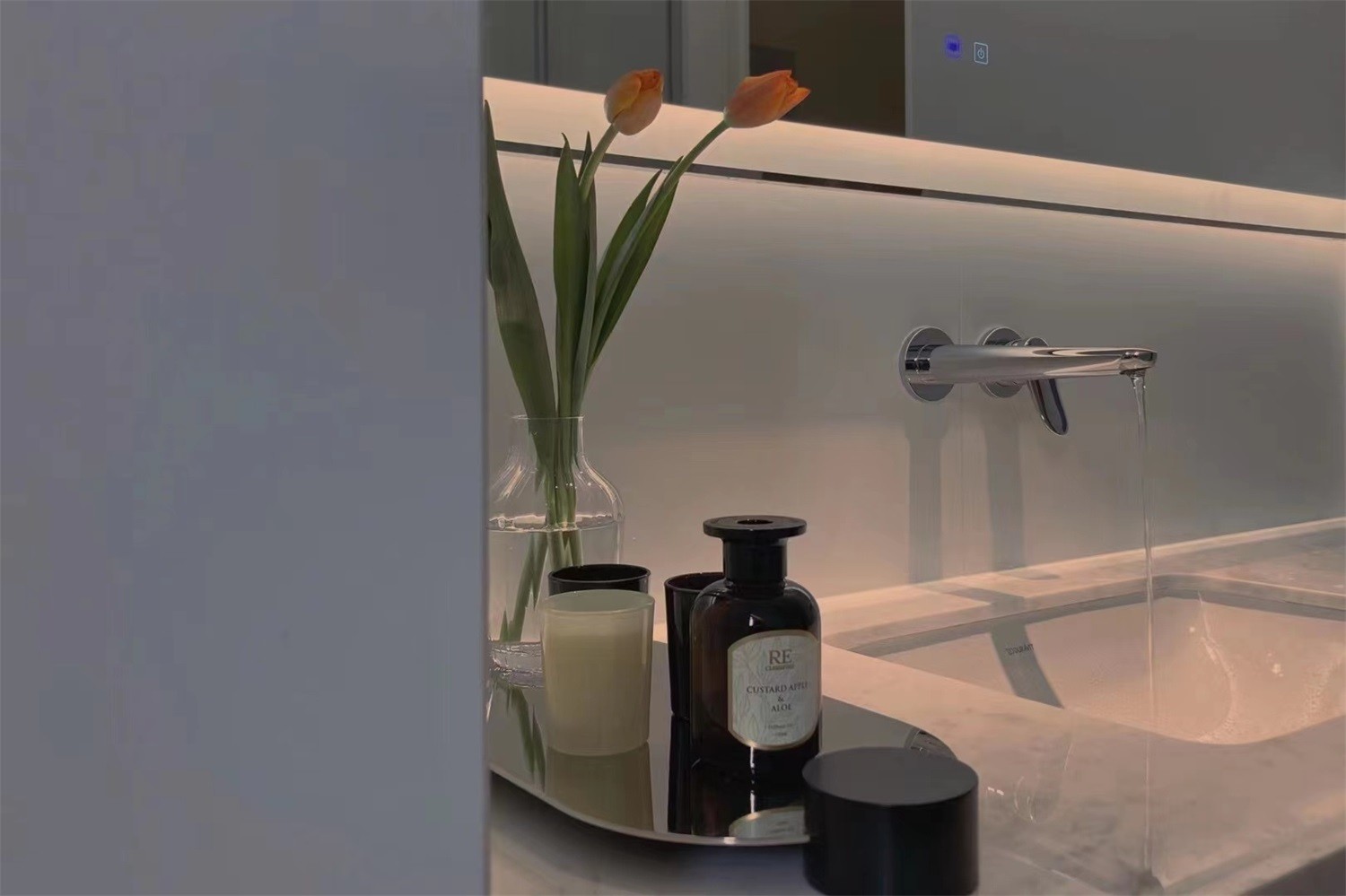 衛(wèi)生間一角,暖光與郁金香形成溫柔一隅。