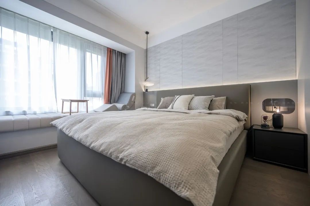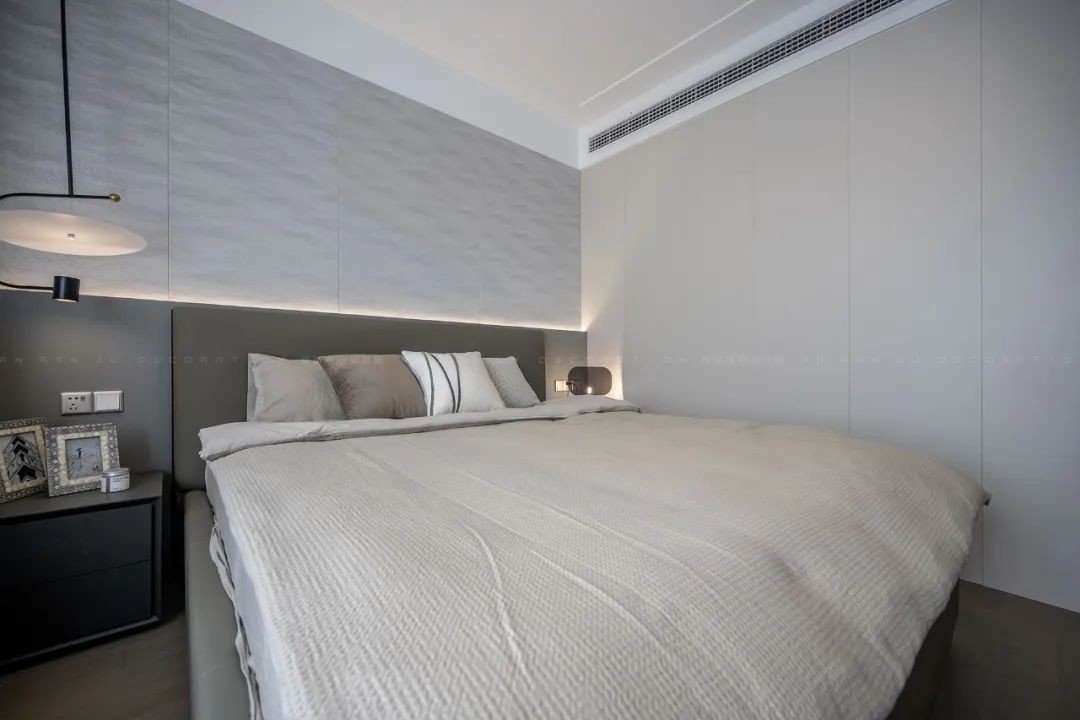 主臥做了半墻設(shè)計,上下分色,燈槽往墻上打,再通過護(hù)墻板漫反射過來,形成光影交錯的效果,給平平無奇的臥室多了幾分“韻味”。