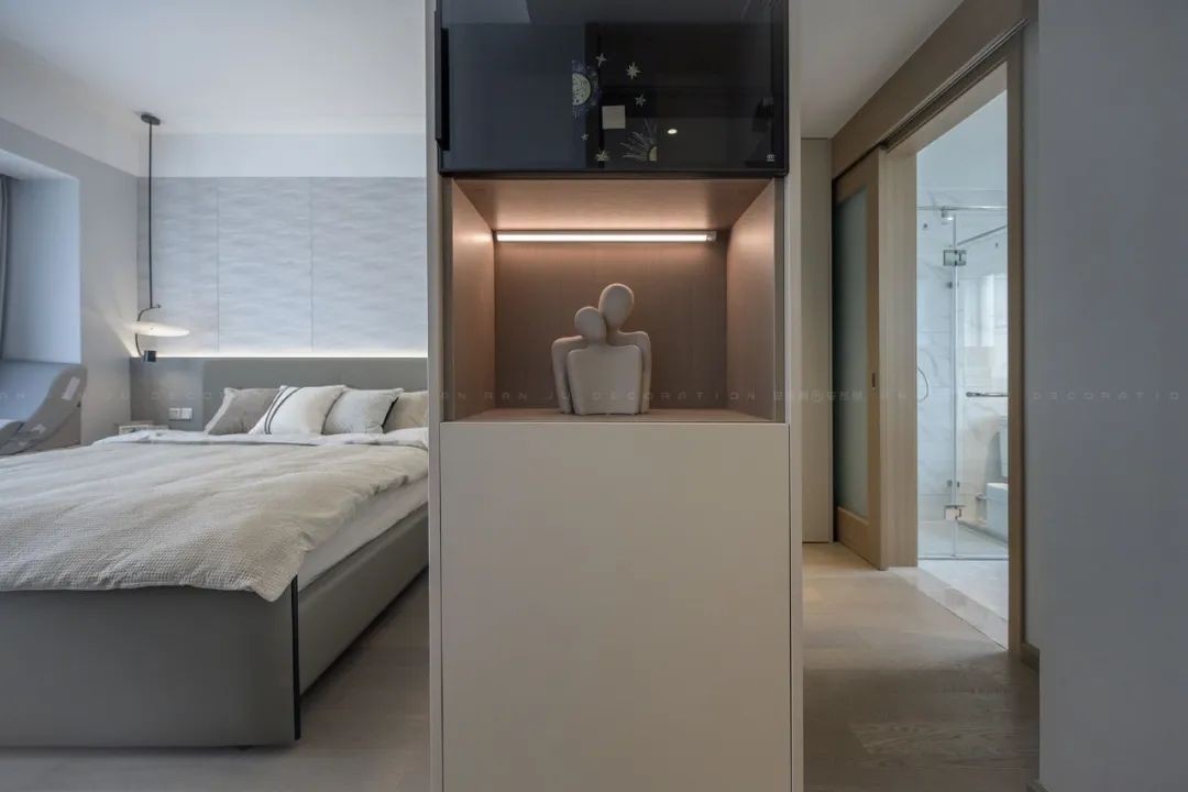 臥室的頂面重新做了吊頂設(shè)計,配合L型衣帽柜做了功能上的重組,阻擋床正對衛(wèi)生間的尷尬,如玉般的整體配色不會顯得空間逼仄。