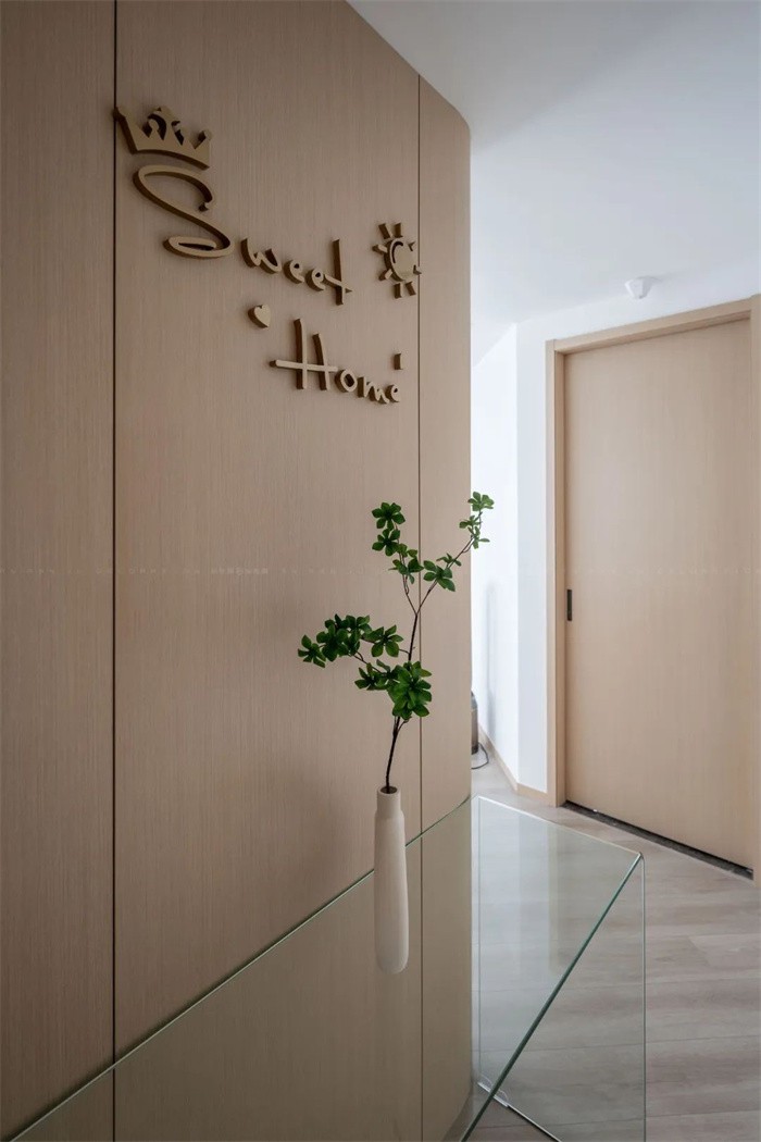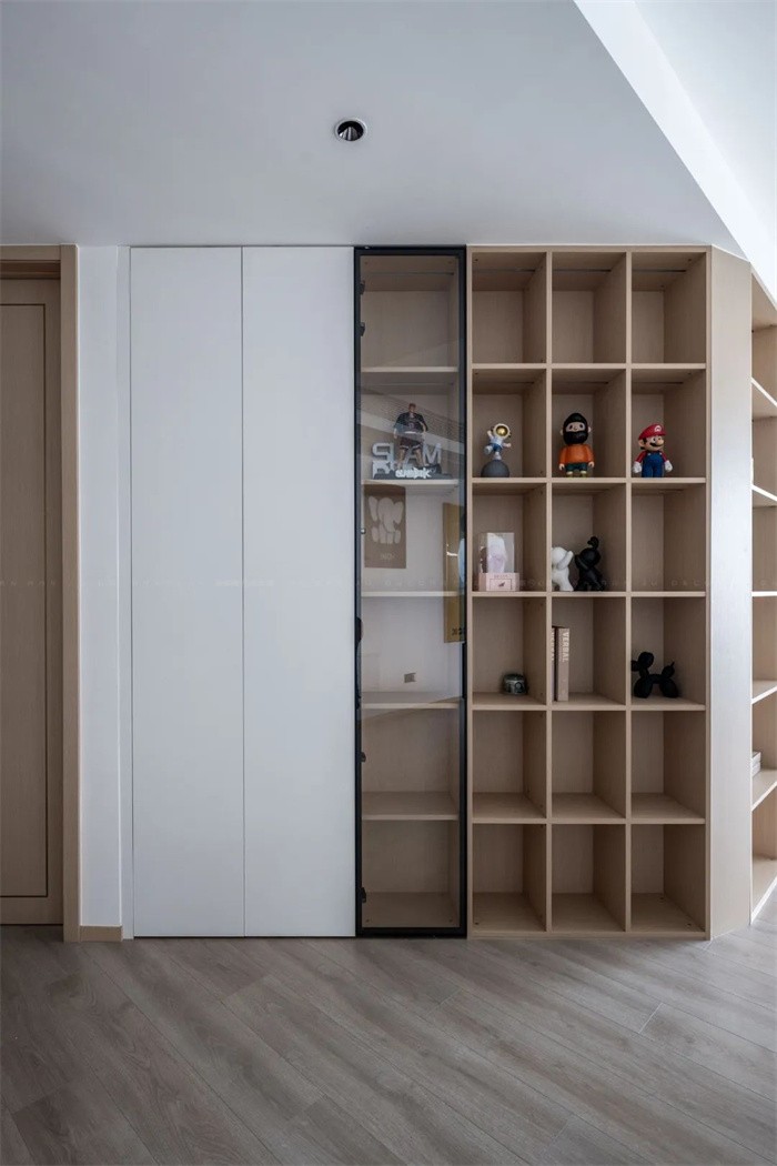 沙發(fā)背后做了整體收納墻,緊挨主臥的門口,配合黑色邊框玻璃門,盡顯神秘感,極簡的配色,溫柔充滿力量,加之傾斜而來的視線,充滿詩意之美。