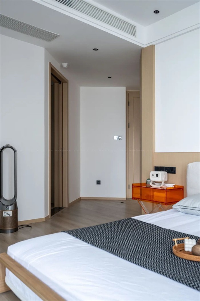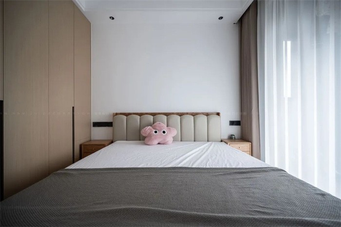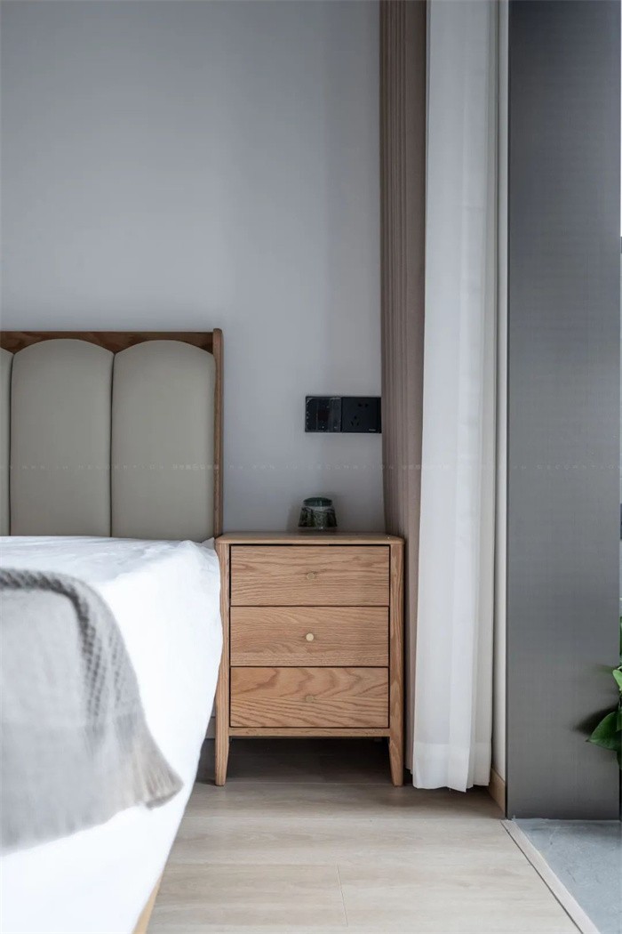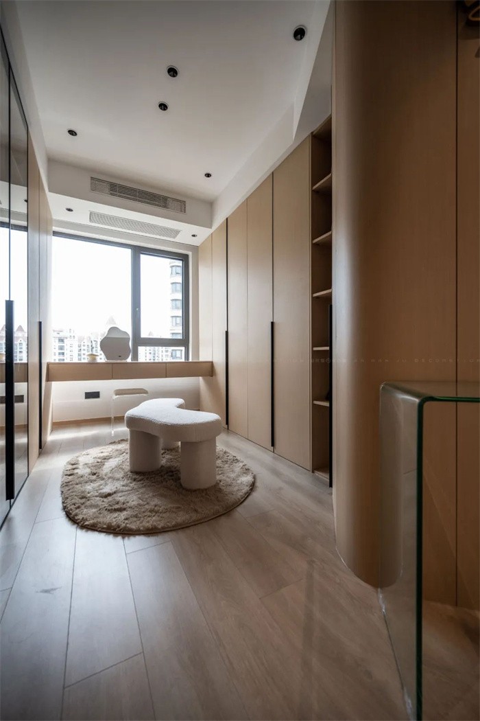 衣帽間的柜體飾面是直接轉(zhuǎn)角包覆到了床頭區(qū)域,原木的質(zhì)感溫潤,好似觸手可及