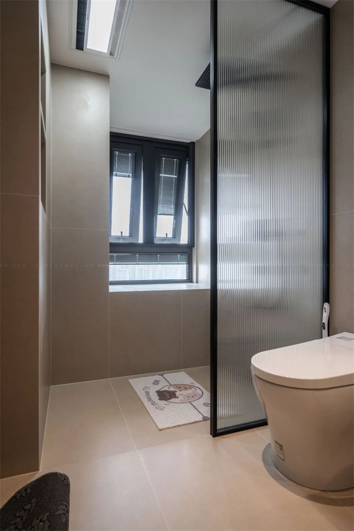 衛(wèi)生間淋浴房做了下沉式處理,單扇玻璃固定,不做推拉門,倒顯得空間尤為寬敞