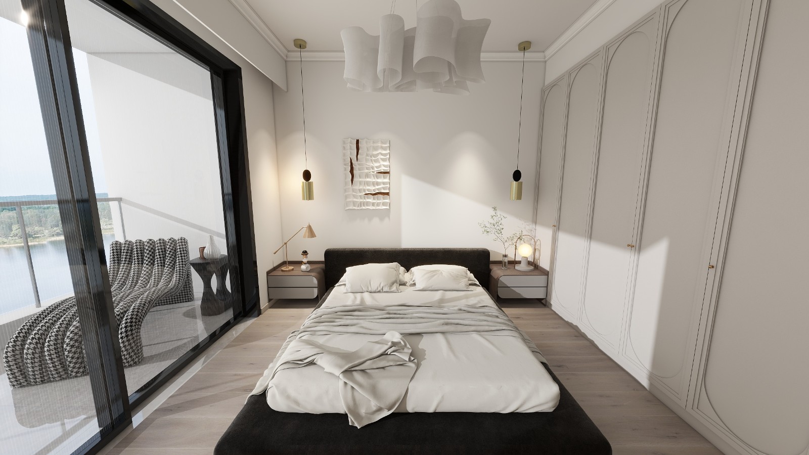 后現(xiàn)代簡(jiǎn)約黑白灰臥室。