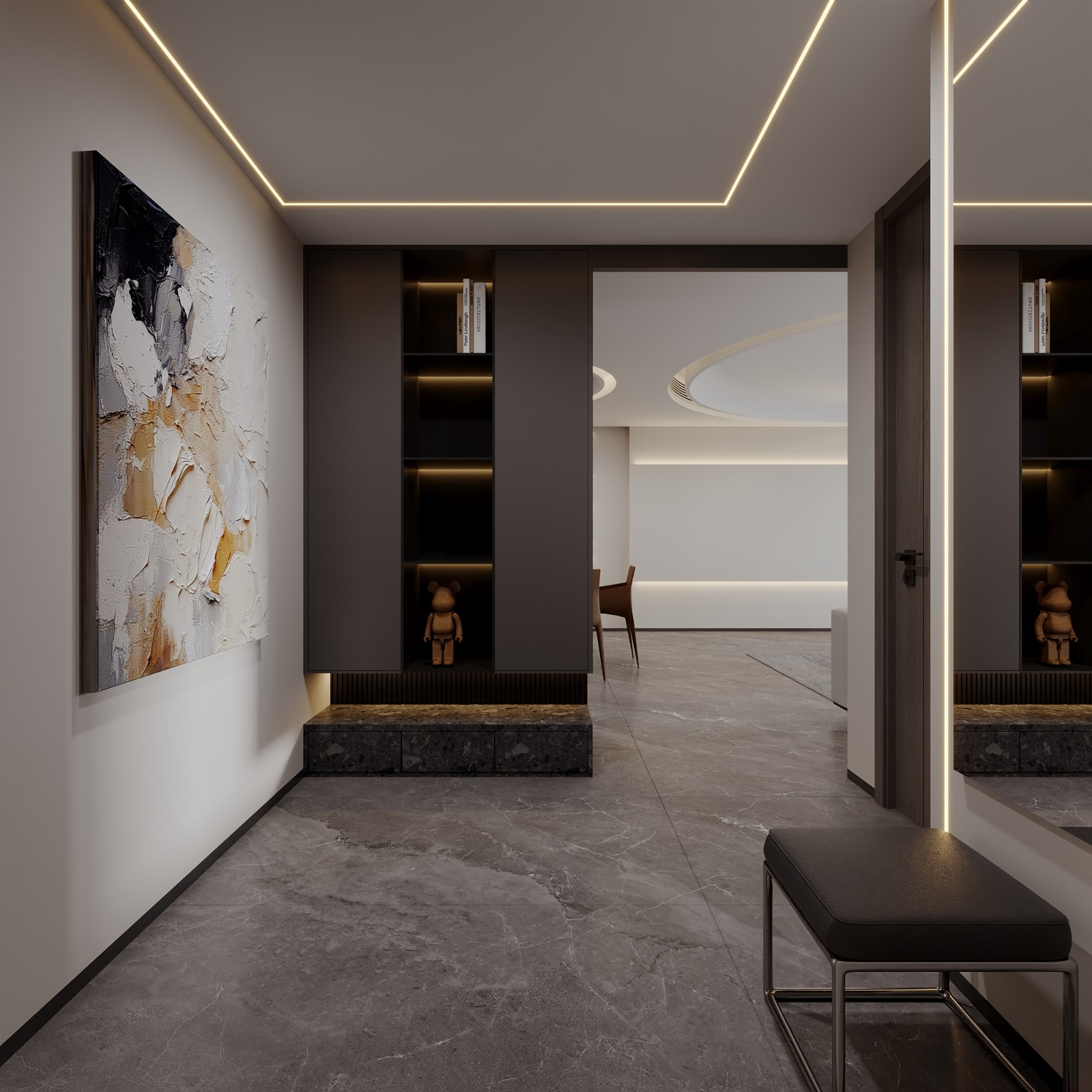 玄關(guān)處增加了一組玄關(guān)柜,為入戶增加了一處?kù)n麗的風(fēng)景,同時(shí)也保證了家里的一定隱私感,墻體吊頂運(yùn)用了燈帶去裝飾,不僅美觀,而且富有設(shè)計(jì)感且能提供足夠的照明與氛圍感
