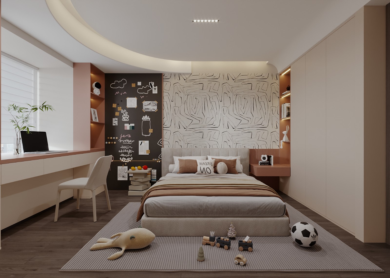 這個(gè)是女孩兒房,異形吊頂增加了空間的趣味性,局部柜體顏色使用了粉色作為空間里的跳色,美觀且不視覺(jué)疲勞