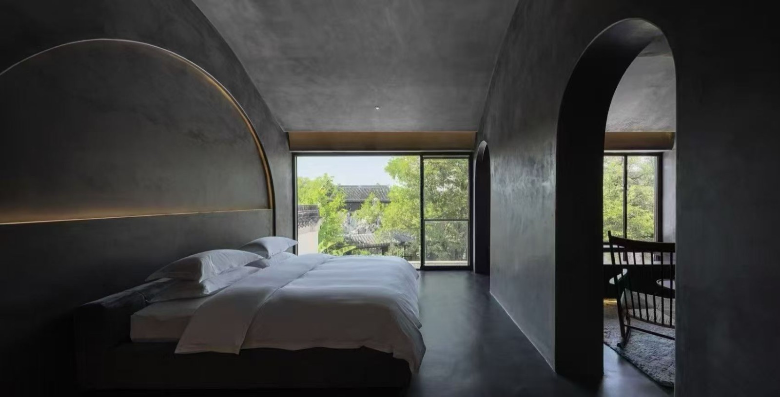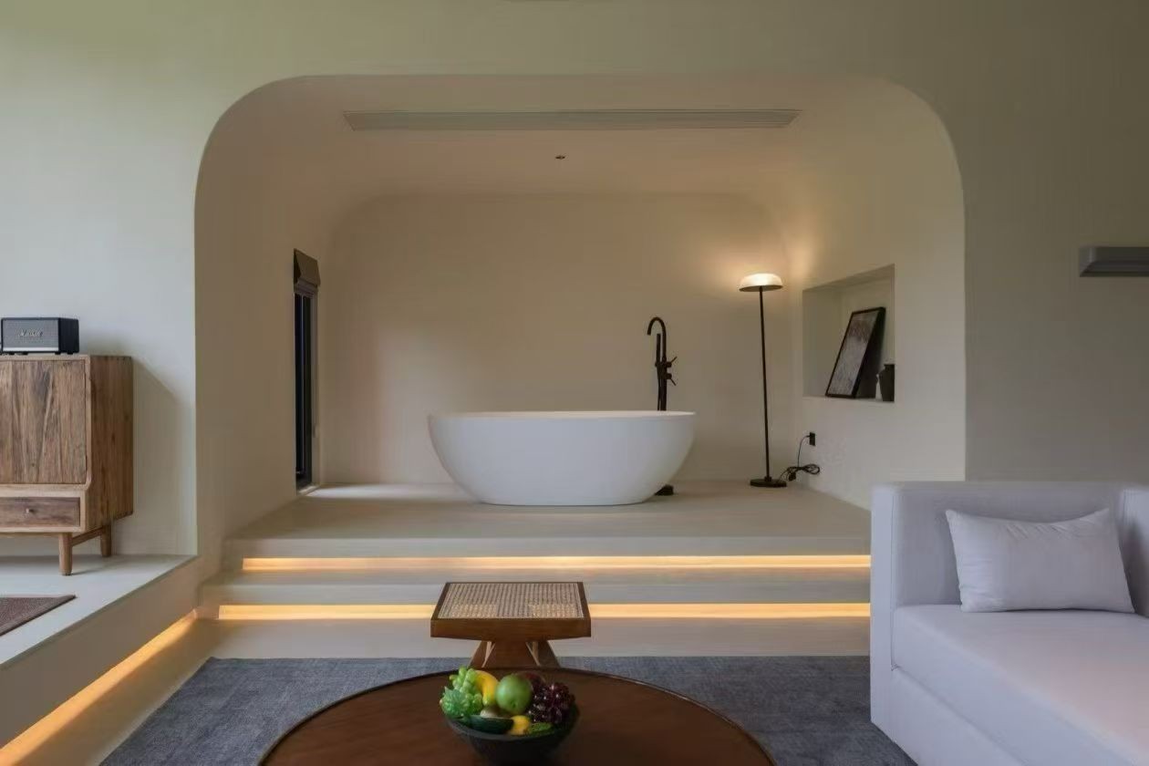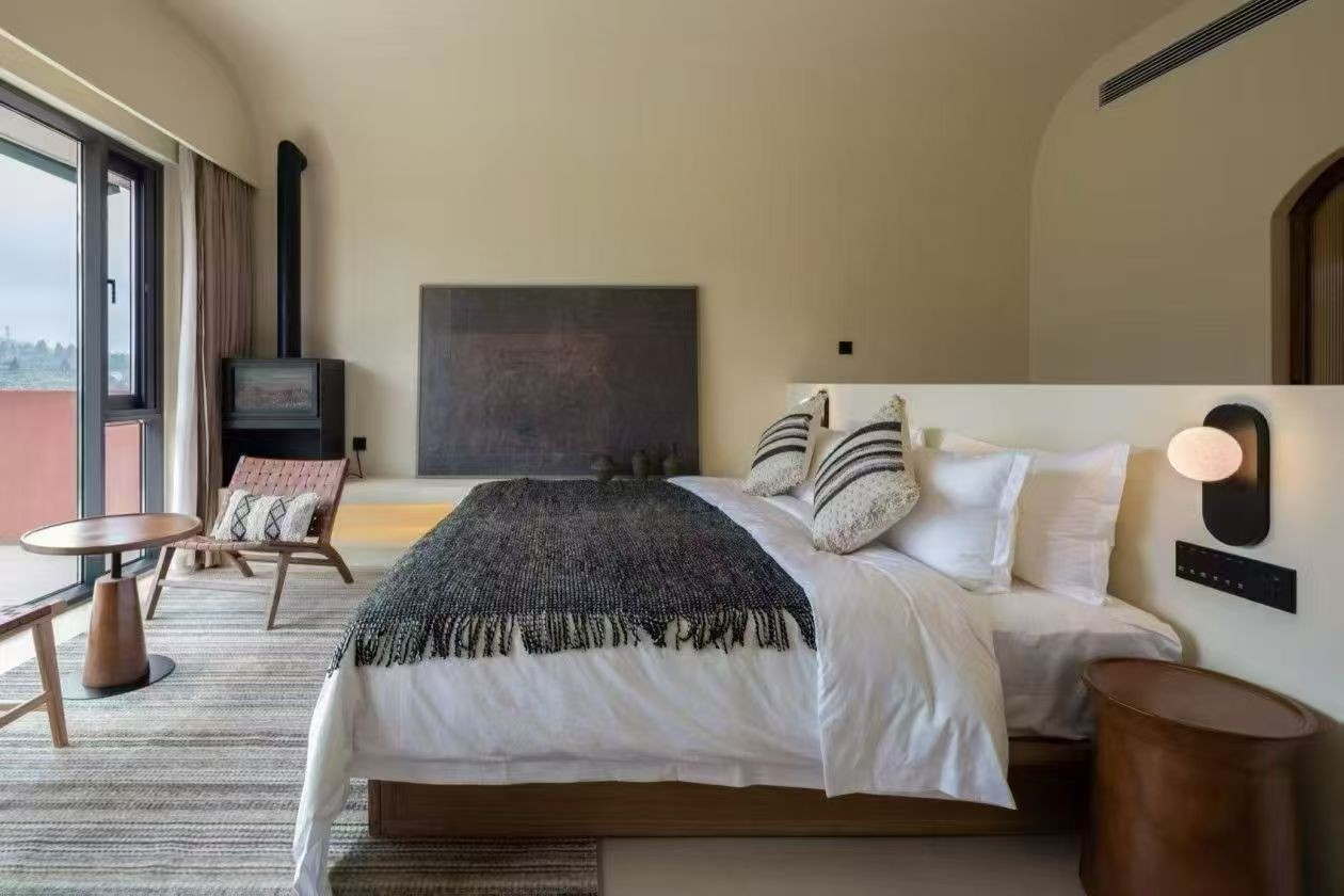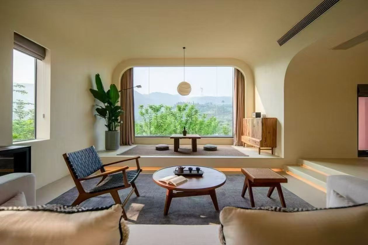 民宿以原木為核心材質(zhì),通鋪淺色實(shí)木地板,搭配低矮的榻榻米休息區(qū)與樟子門衣柜,還原日式質(zhì)樸感。客廳設(shè)下沉式圍爐茶座,墻面掛簡約浮世繪掛畫,角落置枯山水小景。推窗可見庭院里的細(xì)竹與石燈籠,夜晚暖光透過障子紙,營造出靜謐禪意的西山居住氛圍,適合追求松弛感的旅人。