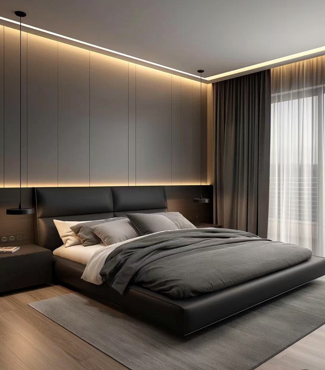 墻面采用木飾面上墻,整體以深色為準(zhǔn)。