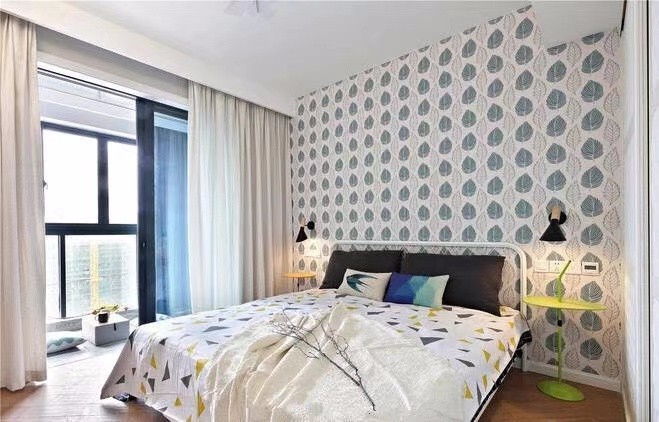 臥室背景墻用了花色壁紙,搭配木地板和簡(jiǎn)易床,使整個(gè)空間看起來(lái)比較明亮。