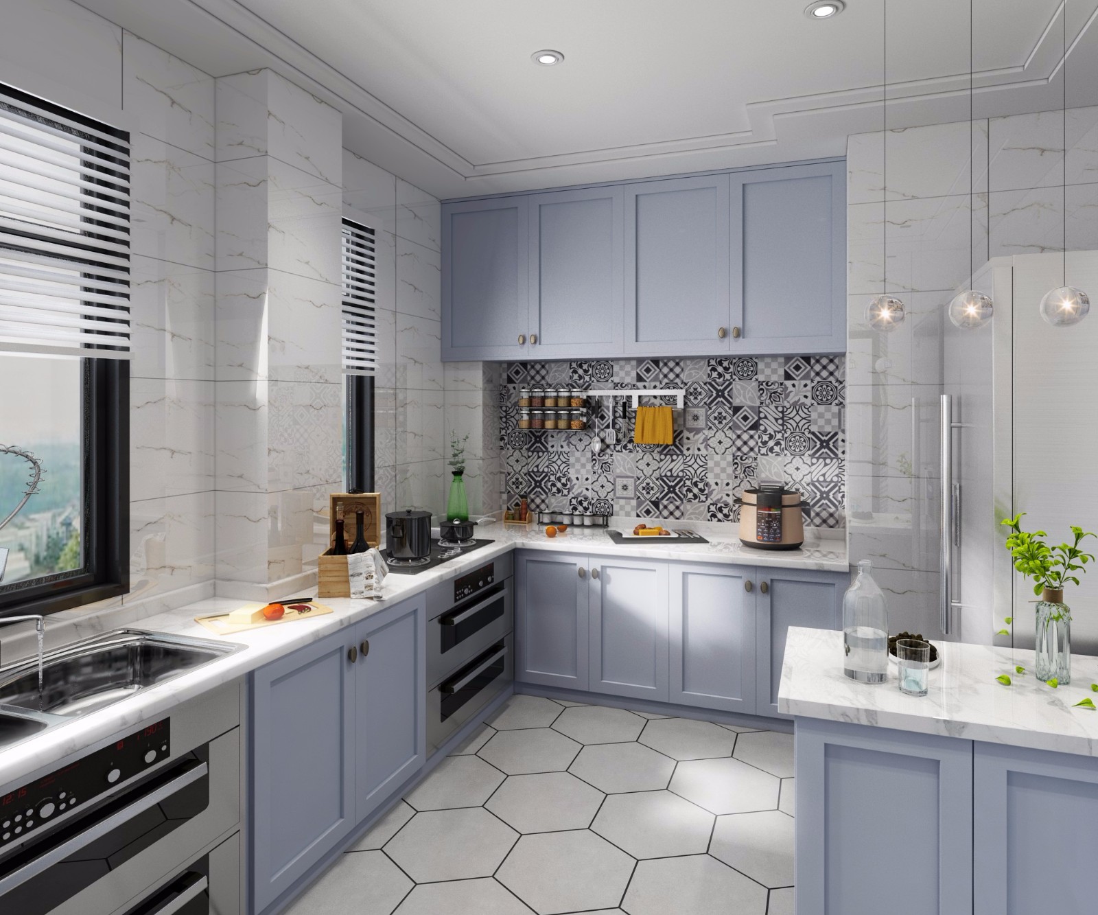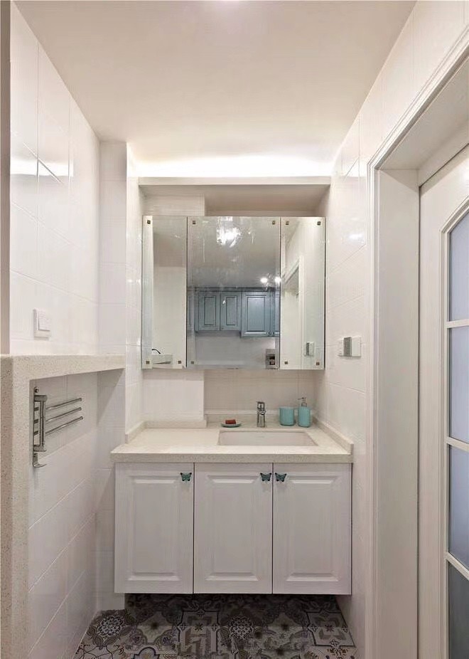 廚房櫥柜采用淡藍(lán)色與白色墻磚整體搭配比較和諧。