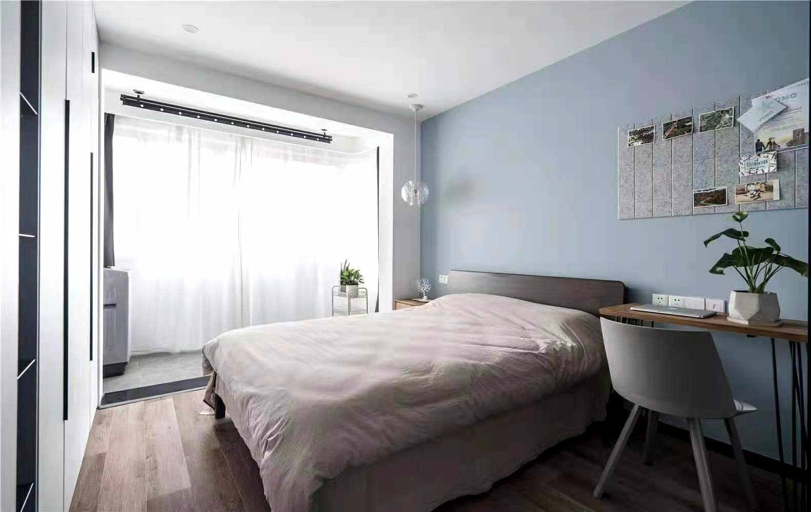 臥室墻面使用淡藍色,搭配木地板,使整個空間比較開闊。