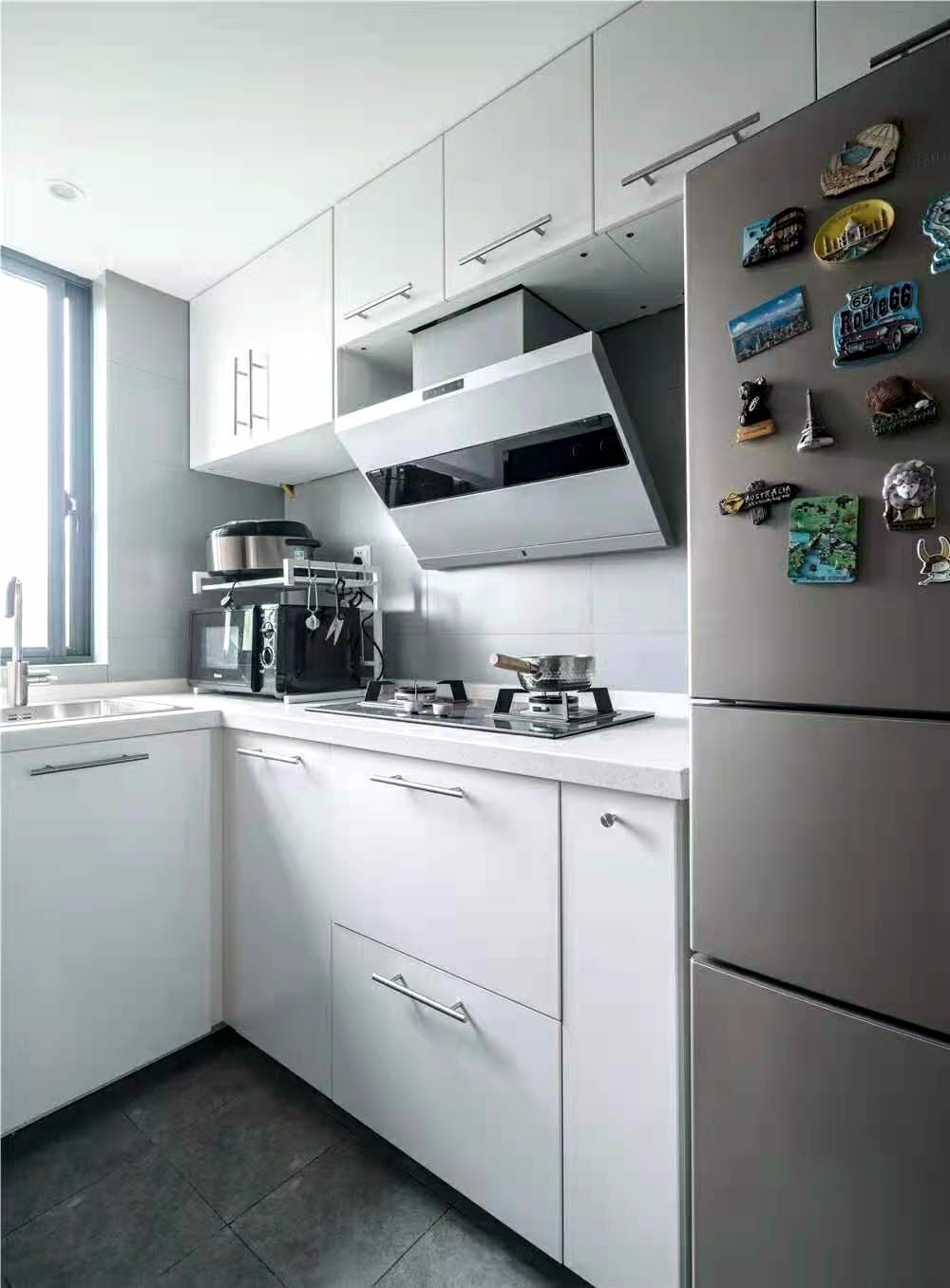 廚房灰墻磚,灰地磚,搭配白色櫥柜,深淺色對比明顯。
