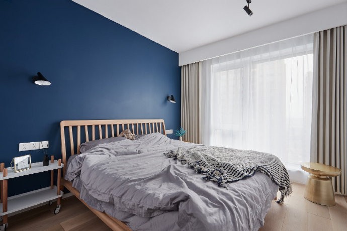 深藍色的背景墻培生原木色的床,濃郁的北歐風格