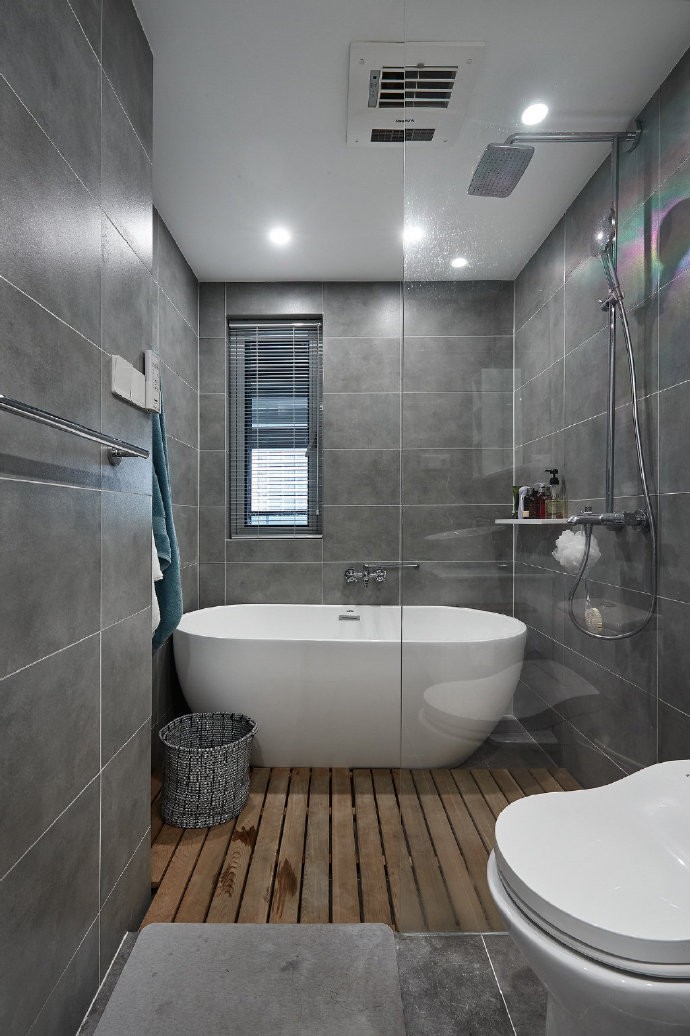 衛(wèi)生間采用生灰色的墻地磚,淺色的衛(wèi)浴,經(jīng)典的配色