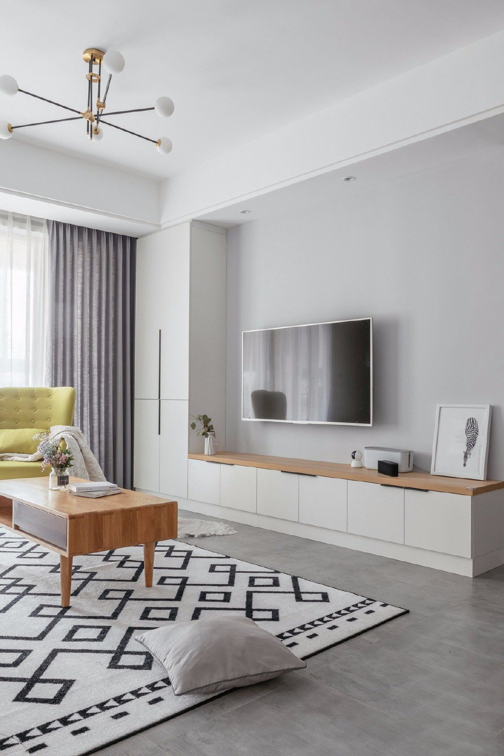 客廳主要以黑白灰為主,吊頂為直線吊頂,軟裝配飾采用明亮的顏色點(diǎn)綴。