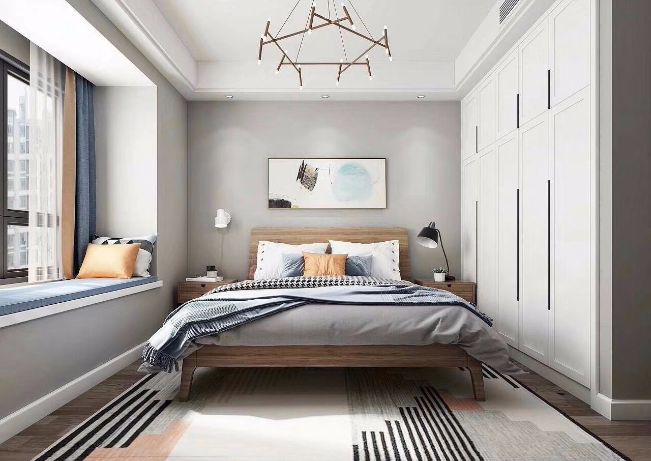 主臥原木色床搭配白色衣柜,木色地板,顏色整體比較和諧統(tǒng)一。