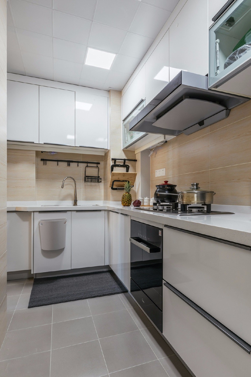櫥柜采用白色烤漆柜,顏色光澤度比較亮。