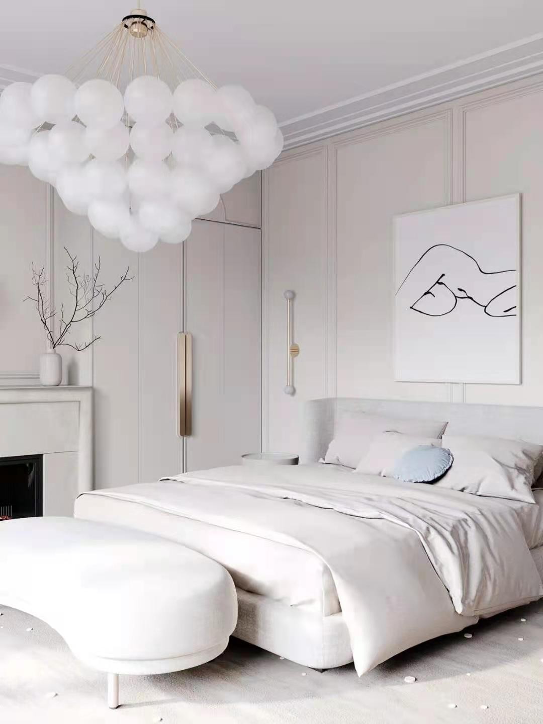臥室中使用大面積的白色,營(yíng)造舒適的休憩氛圍,床頭的背景墻,使空間的細(xì)節(jié)設(shè)計(jì)更加豐富,球形的白色吊燈,為整個(gè)空間帶來(lái)夢(mèng)幻感。黃銅材質(zhì)的使用,提升了整體的格調(diào)。衣帽間依據(jù)屋主的需求量身定制,還具有梳妝臺(tái),透明玻璃與黃銅的結(jié)合,處處體現(xiàn)了精致細(xì)節(jié)。