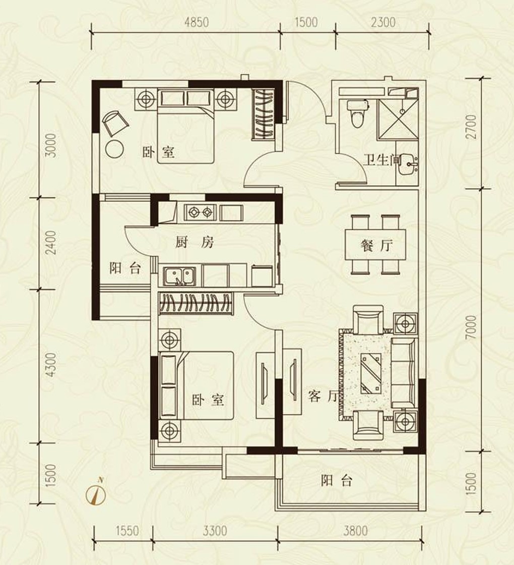 名景花園兩室戶型圖中式風(fēng)格