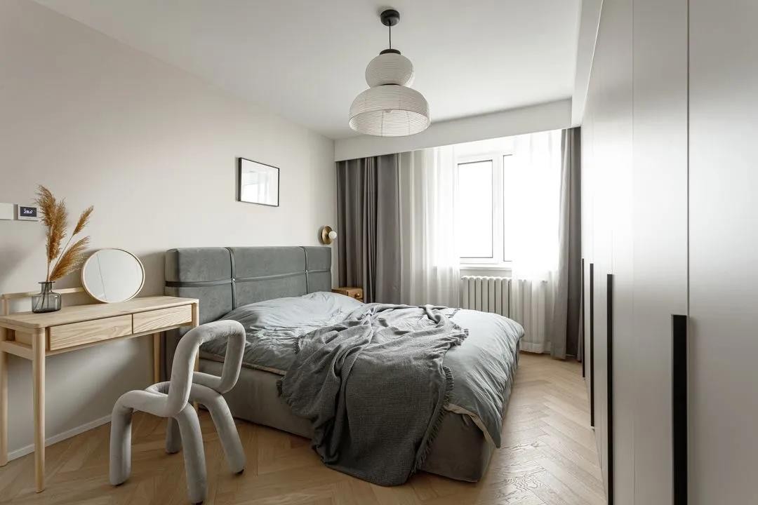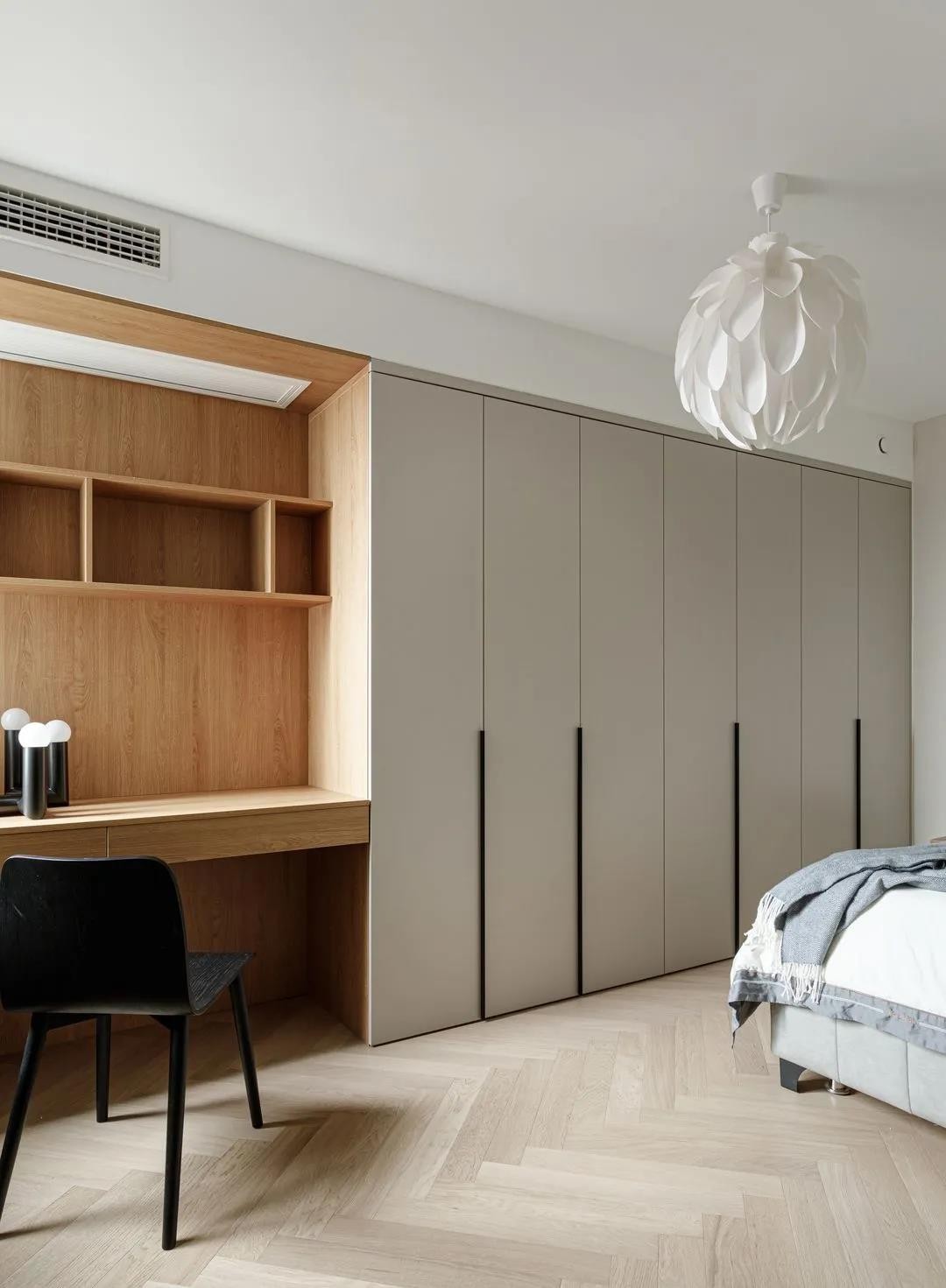 主臥墻面依舊延用公共活動空間主基調(diào),素雅的空間布置散發(fā)著安寧恬靜。滿墻通頂衣柜承載了屋主的功能需求。