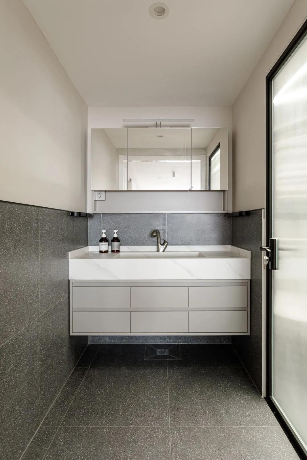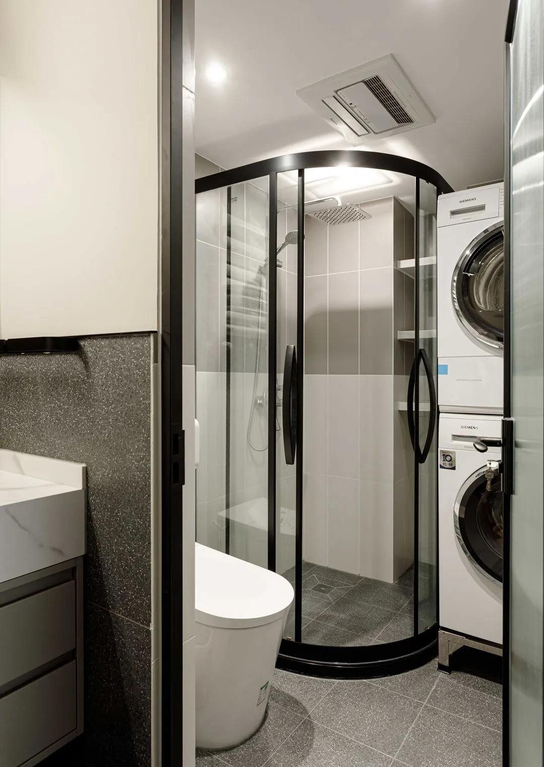 洗手臺下方儲物空間選做抽屜整齊美觀;長虹玻璃隔斷將干區(qū)與濕區(qū)分隔,更顯精致。