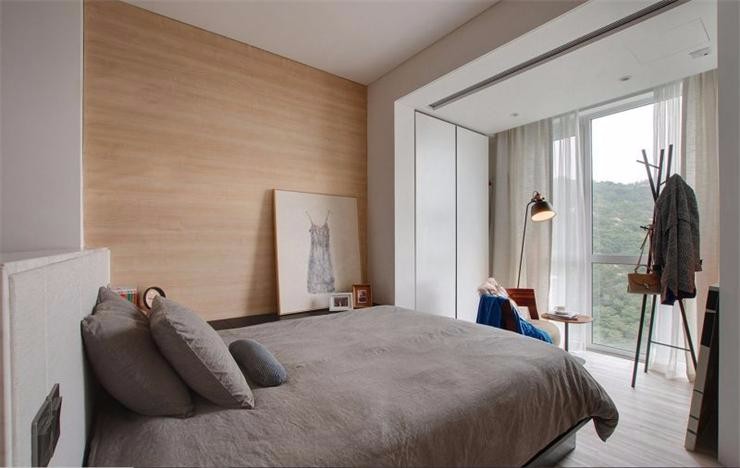 臥室區(qū)域,采用溫馨的木作飾板作為背景墻,床邊擱板可以放置睡前讀物,隨手取放很方便。?