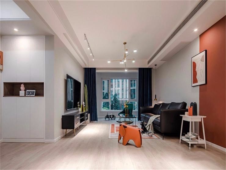客廳的沙發(fā)背景墻用復(fù)古紅與灰色拼接,恰到好處的裝飾畫使這面拼色墻完美呈現(xiàn)。