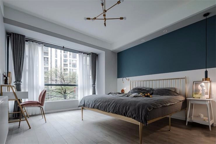 主臥藍(lán)白拼色墻,灰色窗簾與床品,營造適合睡眠的靜謐。