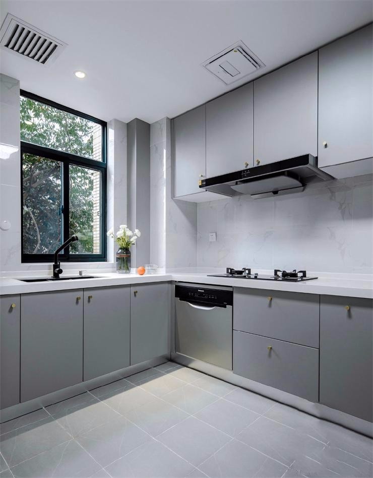 廚房干凈的灰色櫥柜配上金色把手,大理石墻面和地面的灰磚非常易打理。