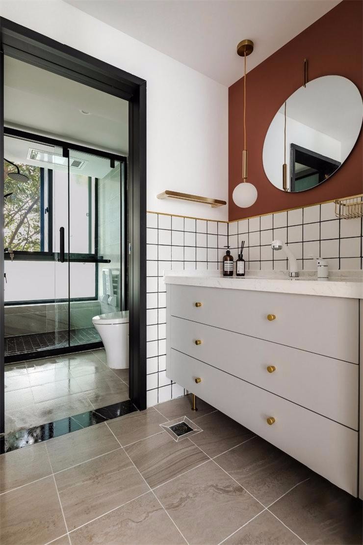 衛(wèi)生間干區(qū)復(fù)古紅與方塊磚碰撞,配上金色與圓形鏡,腰線也是金屬。濕區(qū)化利用空間,方便使用。