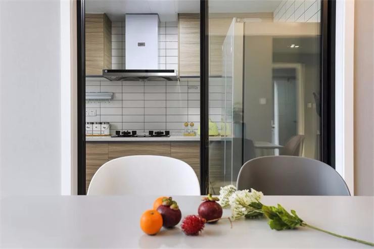 餐廳在客廳的另一邊,靠近超大的落地窗,旁邊玻璃推拉門內(nèi)是廚房區(qū)域,整個(gè)餐廚區(qū)的采光通透性都好到?jīng)]話說(shuō)。