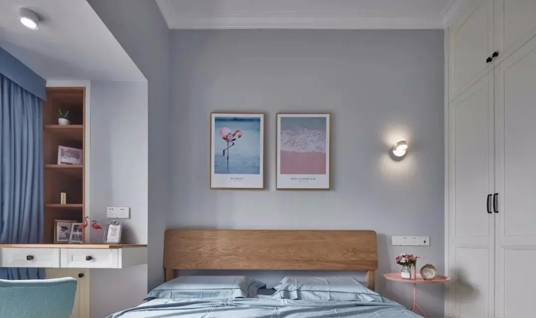 合理利用空間定制的實(shí)木壁龕和小書桌可以將相冊(cè)綠植等小飾品置于其中臥室整潔溫馨