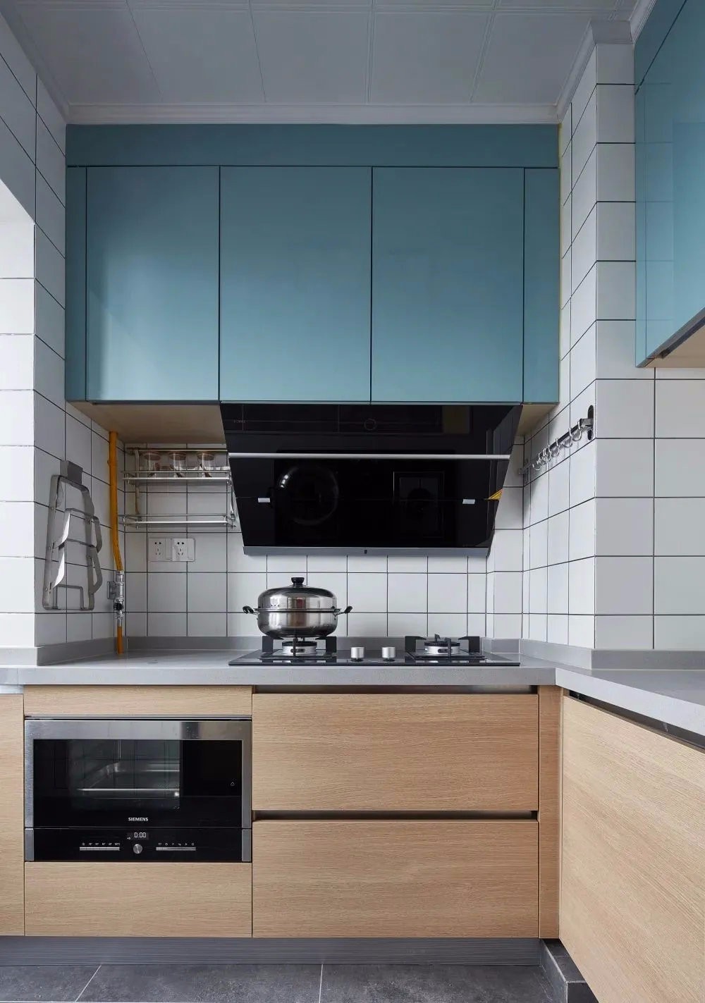 廚房規(guī)劃U型臺(tái)面增加臺(tái)面操作面積在色彩材質(zhì)元素的選擇上也與客餐廳保持一致營造一種簡約自然溫馨的氛圍