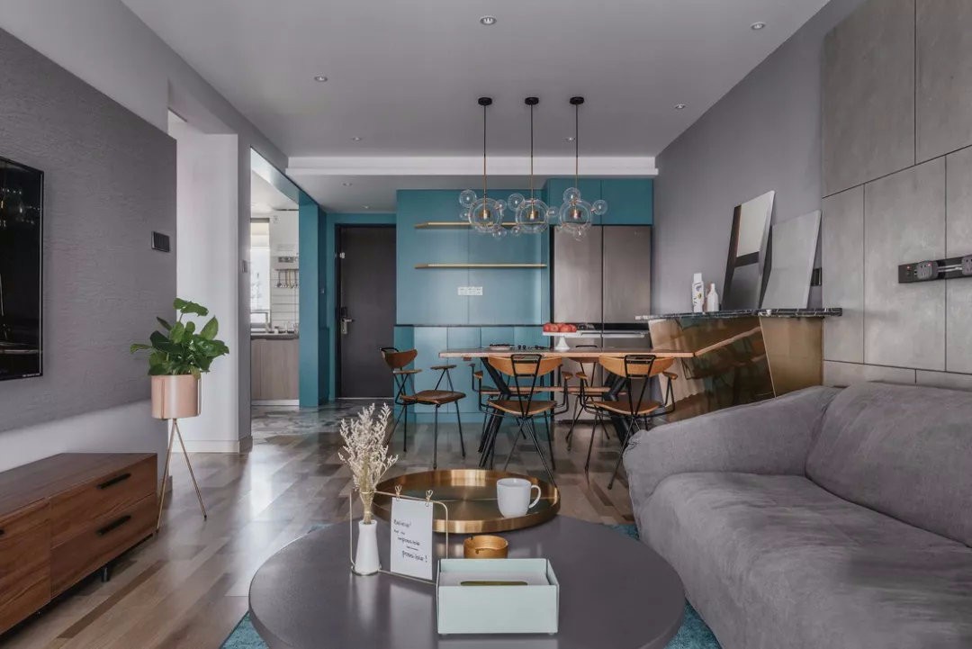 玄關(guān)在六邊形花磚基礎(chǔ)上,設(shè)計(jì)了復(fù)古藍(lán)的儲(chǔ)物柜,并延伸至餐桌。轉(zhuǎn)角的部分做了過渡,帶來更加貼心的觸感與視覺感。
