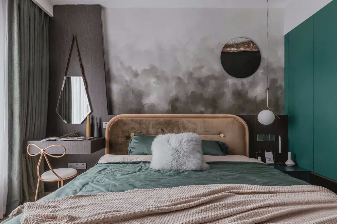 主臥以灰色和綠色為主調(diào),整體柔和而平靜,透露著一種***感。