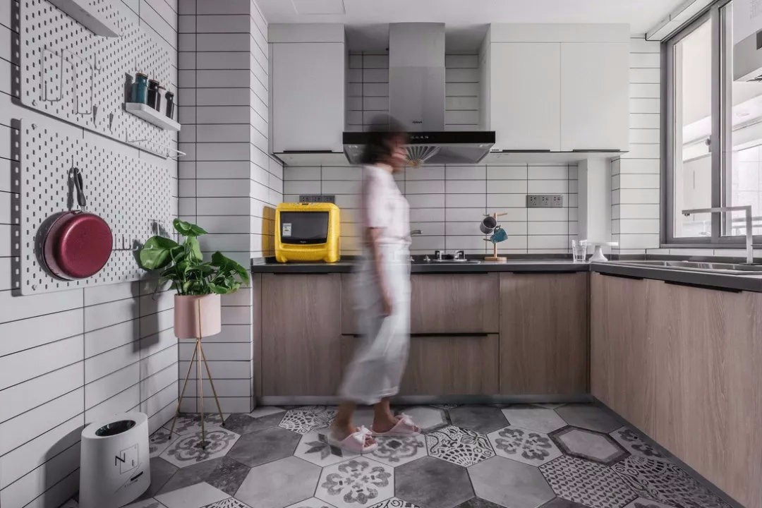 統(tǒng)一的花磚地面,結(jié)合木質(zhì)櫥柜與灰色的操作臺(tái)面,文藝又舒適。
