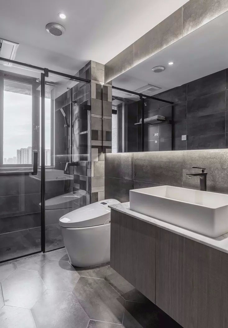 衛(wèi)生間同樣以灰色調(diào)為主,鏡柜上下方設(shè)置燈帶,既不占用空間同時(shí)營造了精致時(shí)尚的氛圍。????