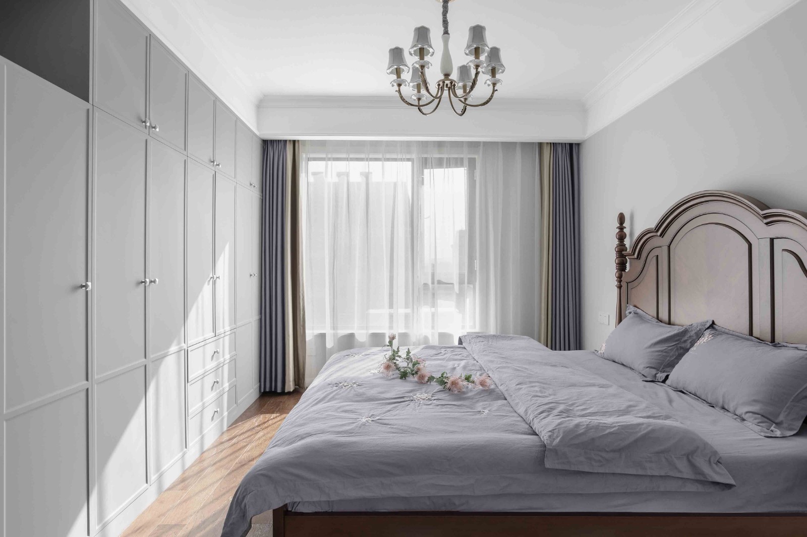主臥定制了滿墻的衣柜滿足收納