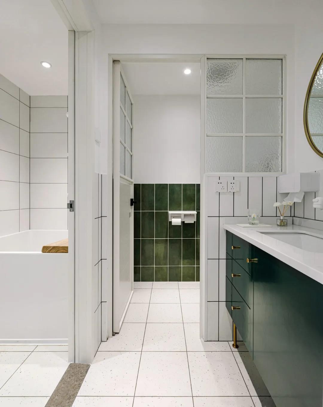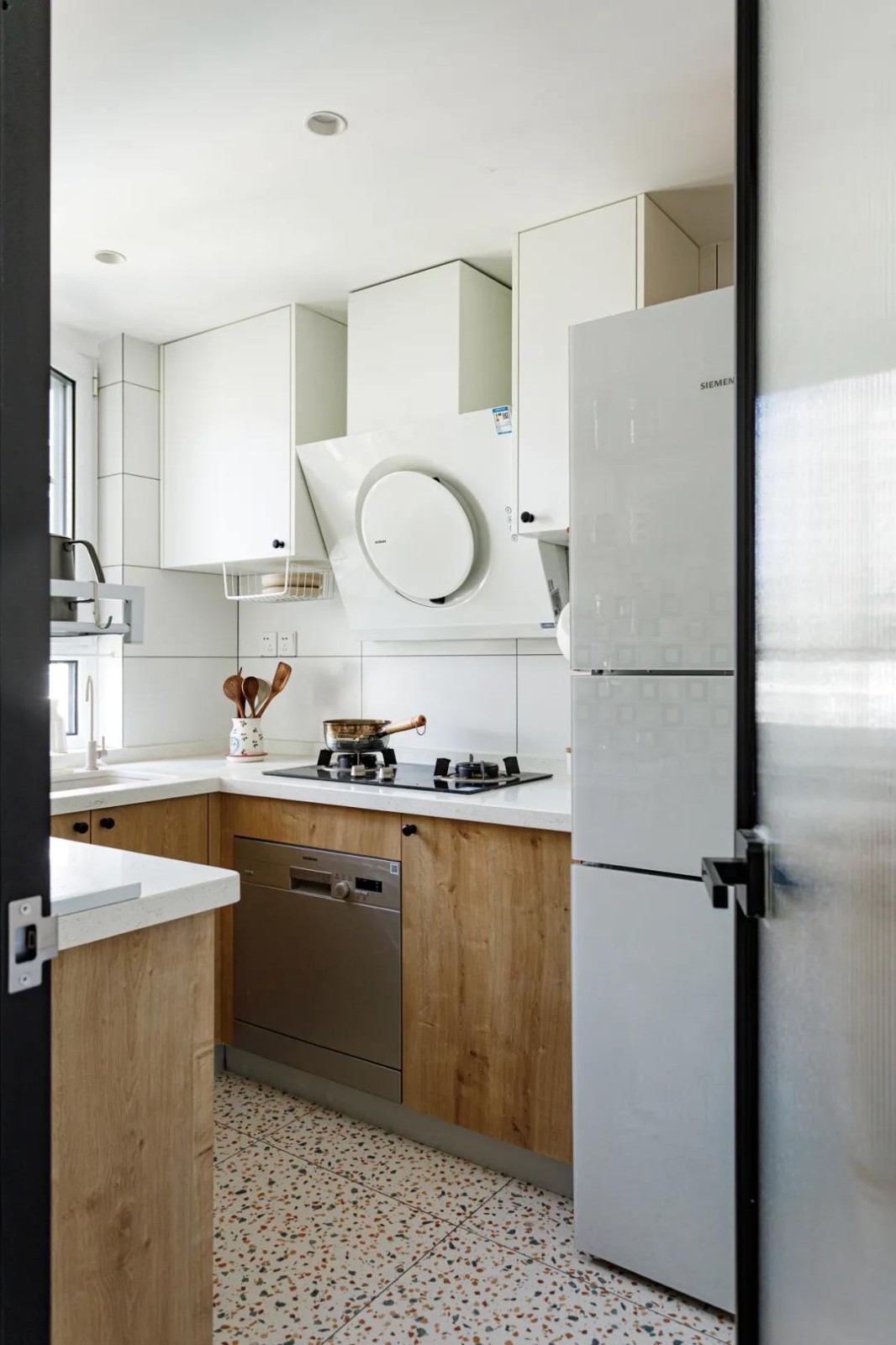 白色和木色的搭配,跟暖色調(diào)的復(fù)古水磨石地磚非常默契,整個(gè)空間都變得有氣質(zhì)~