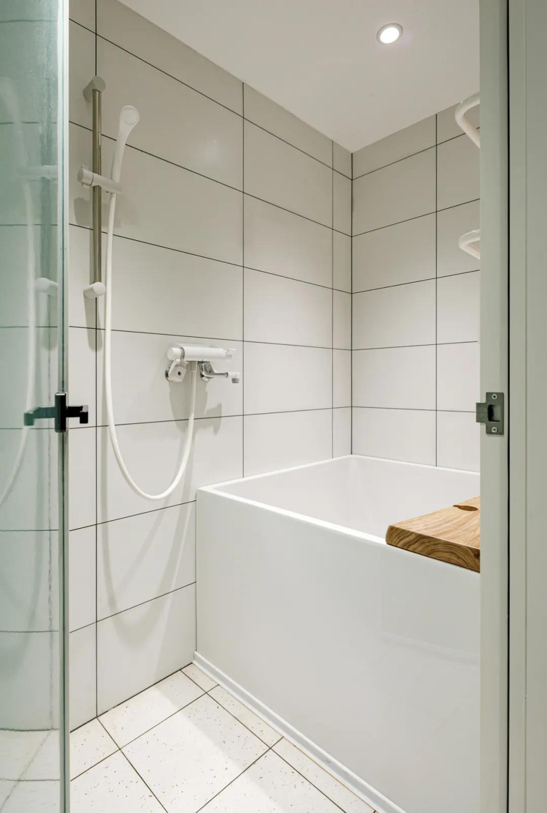 浴室是長條形的,淋浴和浴缸并存。正方形浴缸上配套了榆木置物架,可以一邊泡著熱水浴一邊歡樂的追劇,還可以點(diǎn)上香薰蠟燭,享受一個(gè)人的沐浴時(shí)光。