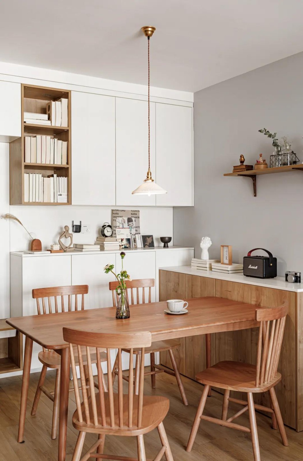 輕盈簡潔的餐桌椅是櫻桃木,相比于橡木、胡桃木,櫻桃木的色澤偏紅,更加溫暖濃郁。餐邊柜就在一旁,隨手就能收納,再也不怕餐桌凌亂~平時(shí)的廚房小電器也可以在這個(gè)區(qū)域使用。