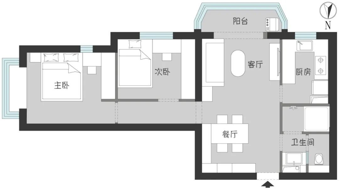 戶型分析: 1. 一進(jìn)門就是餐廳,沒有位置放門廳柜; 2. 衛(wèi)生間和廚房的門對(duì)著,很容易串味; 3. 廚衛(wèi)中間的小走道很雞肋。 整改方向: 1. 將主臥門內(nèi)推至與墻平齊,保留了走廊的完整性 2. 廚衛(wèi)中間的小走廊納入衛(wèi)生間,擴(kuò)充了衛(wèi)生間面積,為三分離打下基礎(chǔ)。
