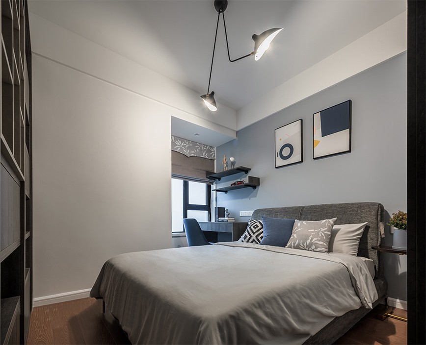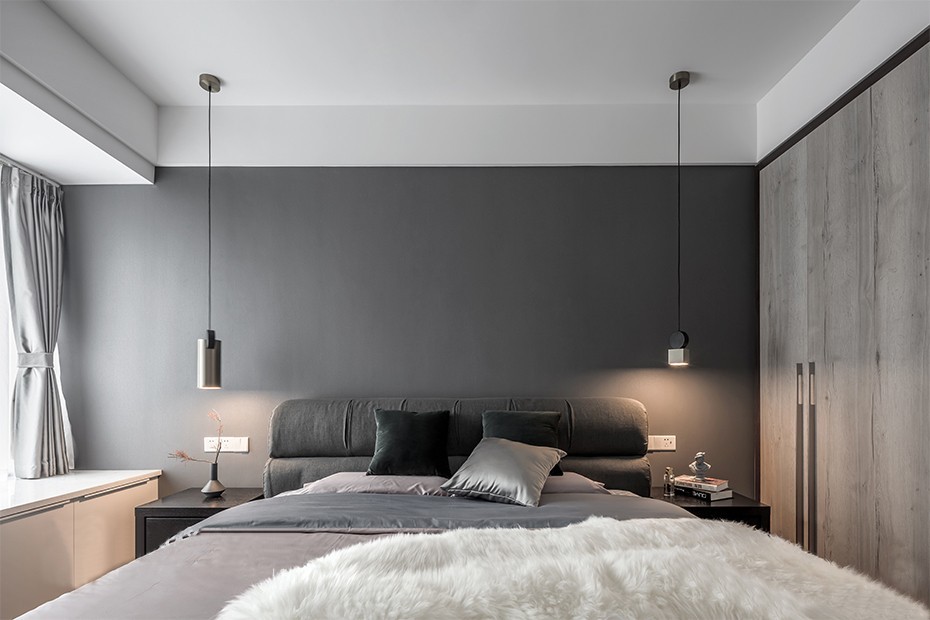 主臥以灰色和白色為主調,打造冷靜優(yōu)雅的空間氛圍。