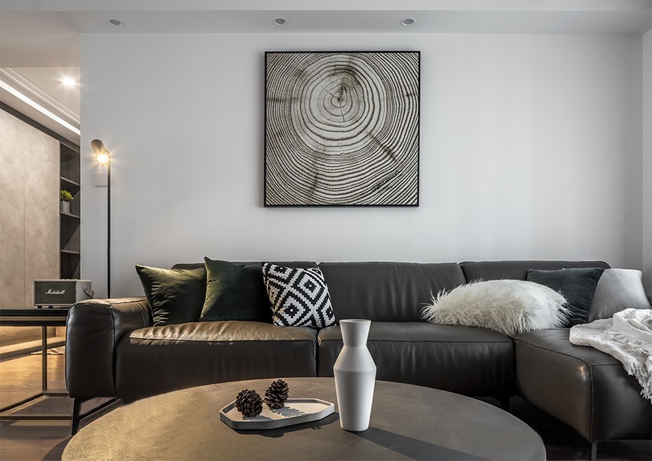 客廳由質感黑白灰打造,極簡沙發(fā)的皮質外形配以現(xiàn)代水泥圓形茶幾,碰撞出特別的氣場。