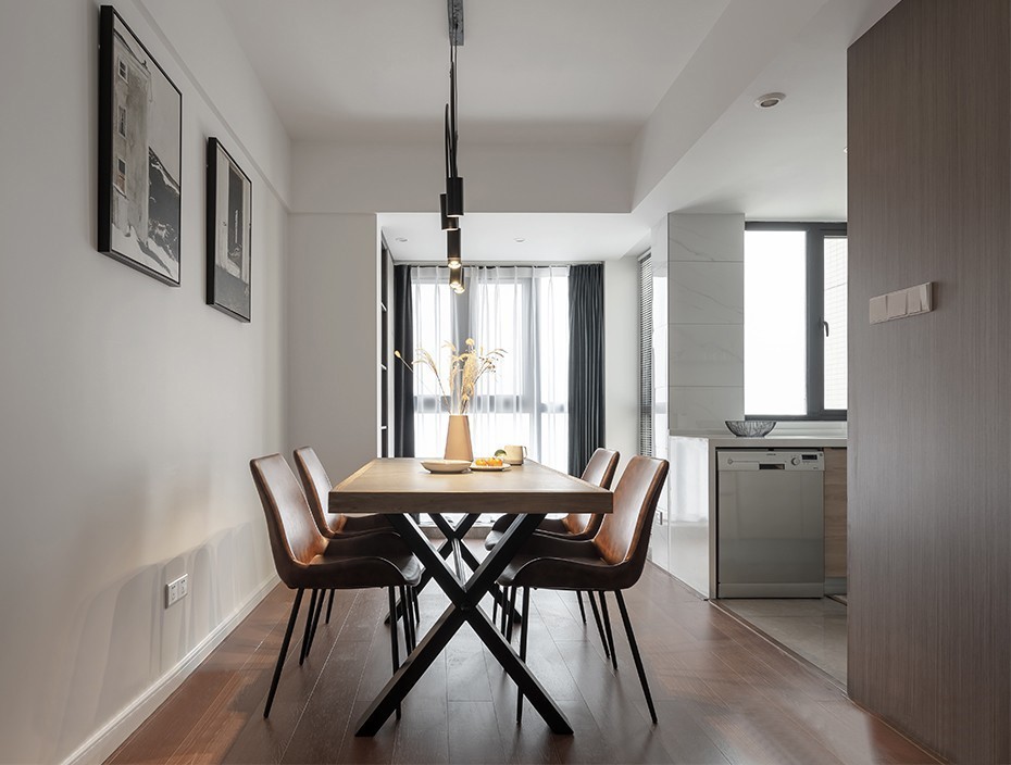 餐廳與廚房相連,通過地面鋪貼不同的材質來進行分割,讓空間看似統(tǒng)一卻又獨立。