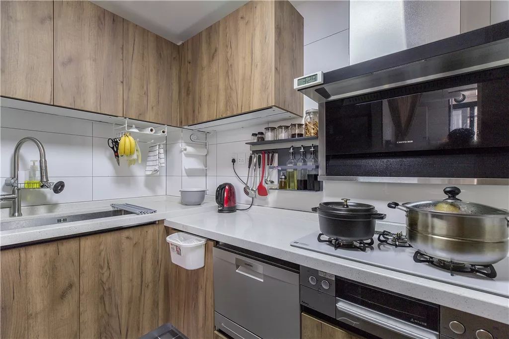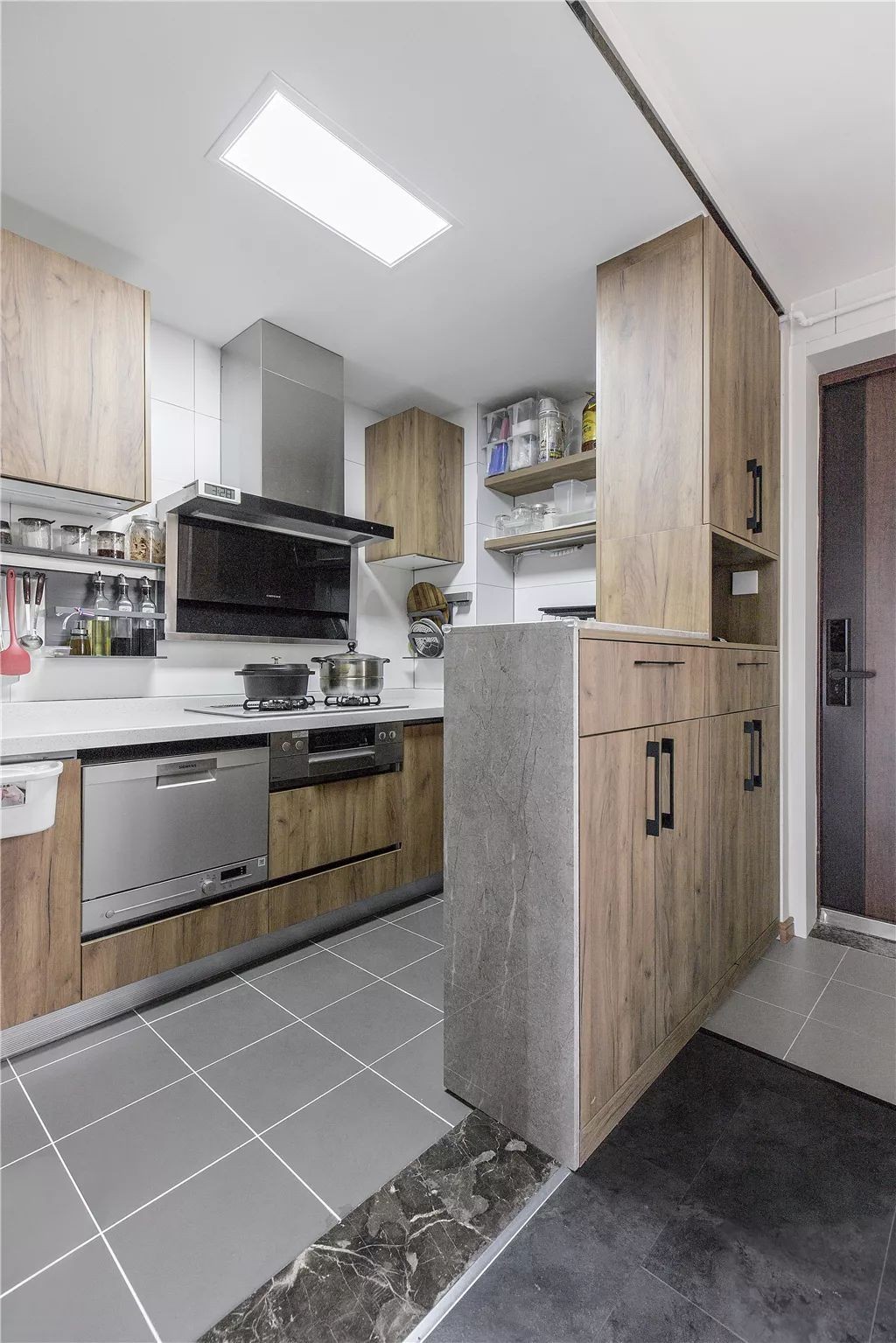▲ 廚房與玄關(guān)相鄰,采用了開放式的格局,玄關(guān)柜+矮柜隔開廚房空間,讓烹飪的空間也更加寬松敞亮。
