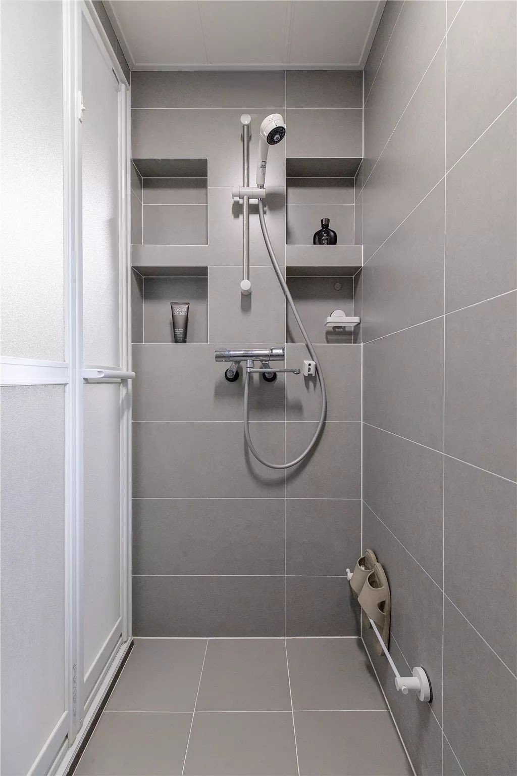 ▲ 淋浴房墻地面鋪設(shè)灰色亞光磚,在淋浴花灑的兩側(cè)都做了壁龕收納,用于存放洗浴用品,取放十分方便。
