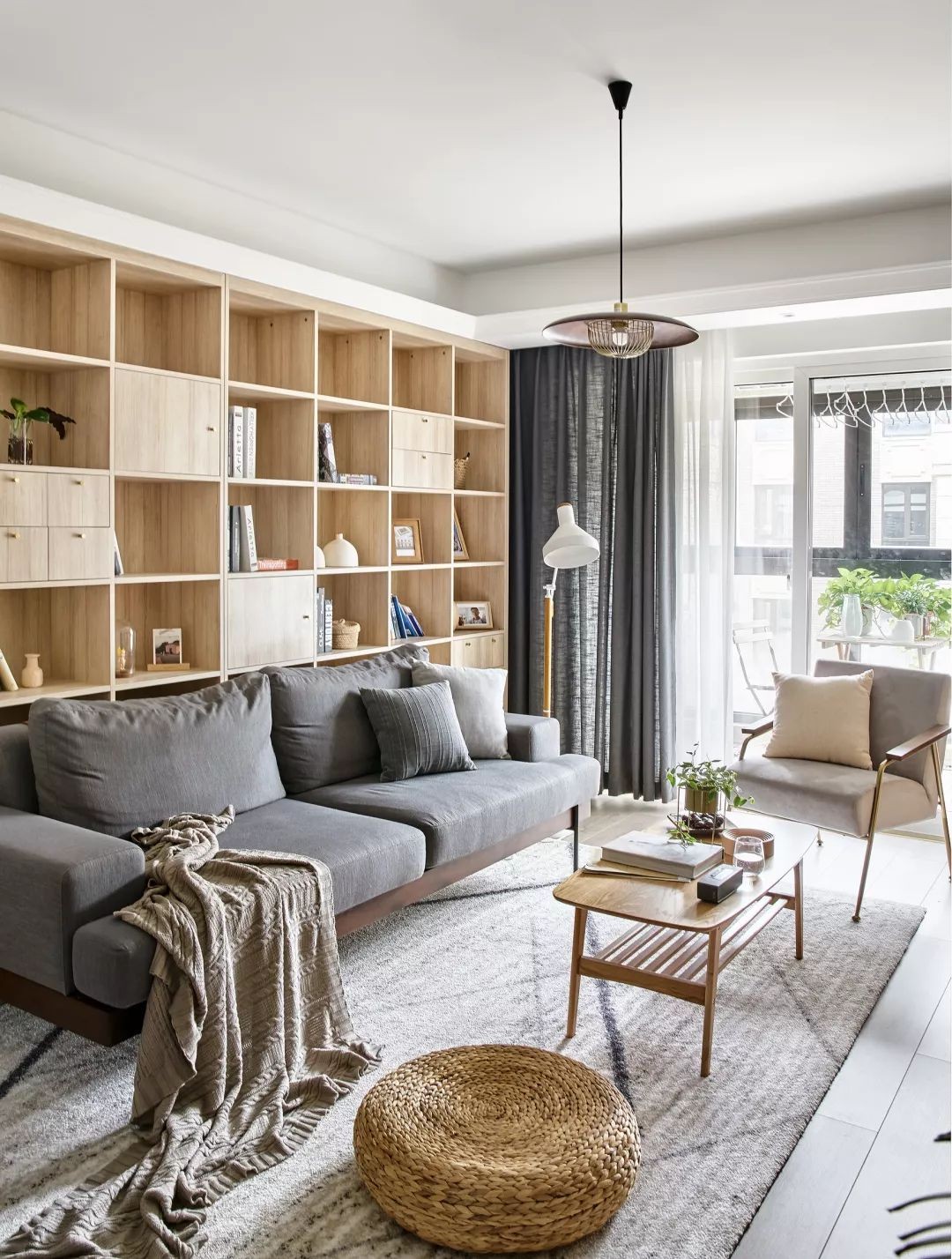 客廳整體以灰白色與木質(zhì)為主調(diào),灰色布藝沙發(fā)簡(jiǎn)約有質(zhì)感,后方是一面木質(zhì)書(shū)架墻,格外的實(shí)用有情調(diào)。 淺灰色地毯結(jié)合簡(jiǎn)易的木質(zhì)茶幾與休閑椅,還有一個(gè)編