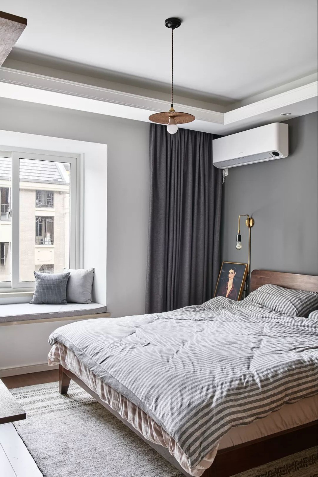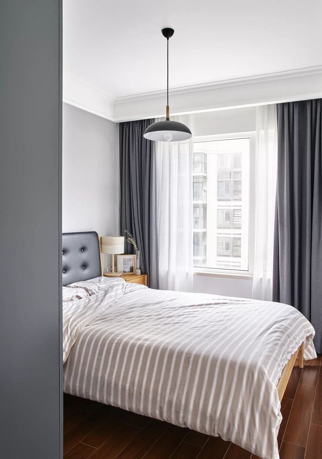 次臥,灰色窗簾與衣柜簡(jiǎn)潔優(yōu)雅,搭配黑色的皮藝靠背床及輕松舒適的床品,